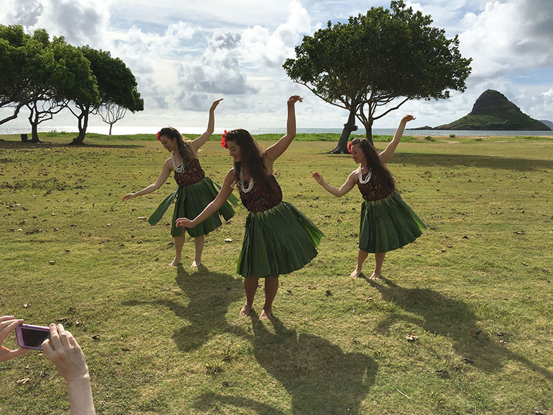 A trio performs a traditional Hawaiian dance on location.